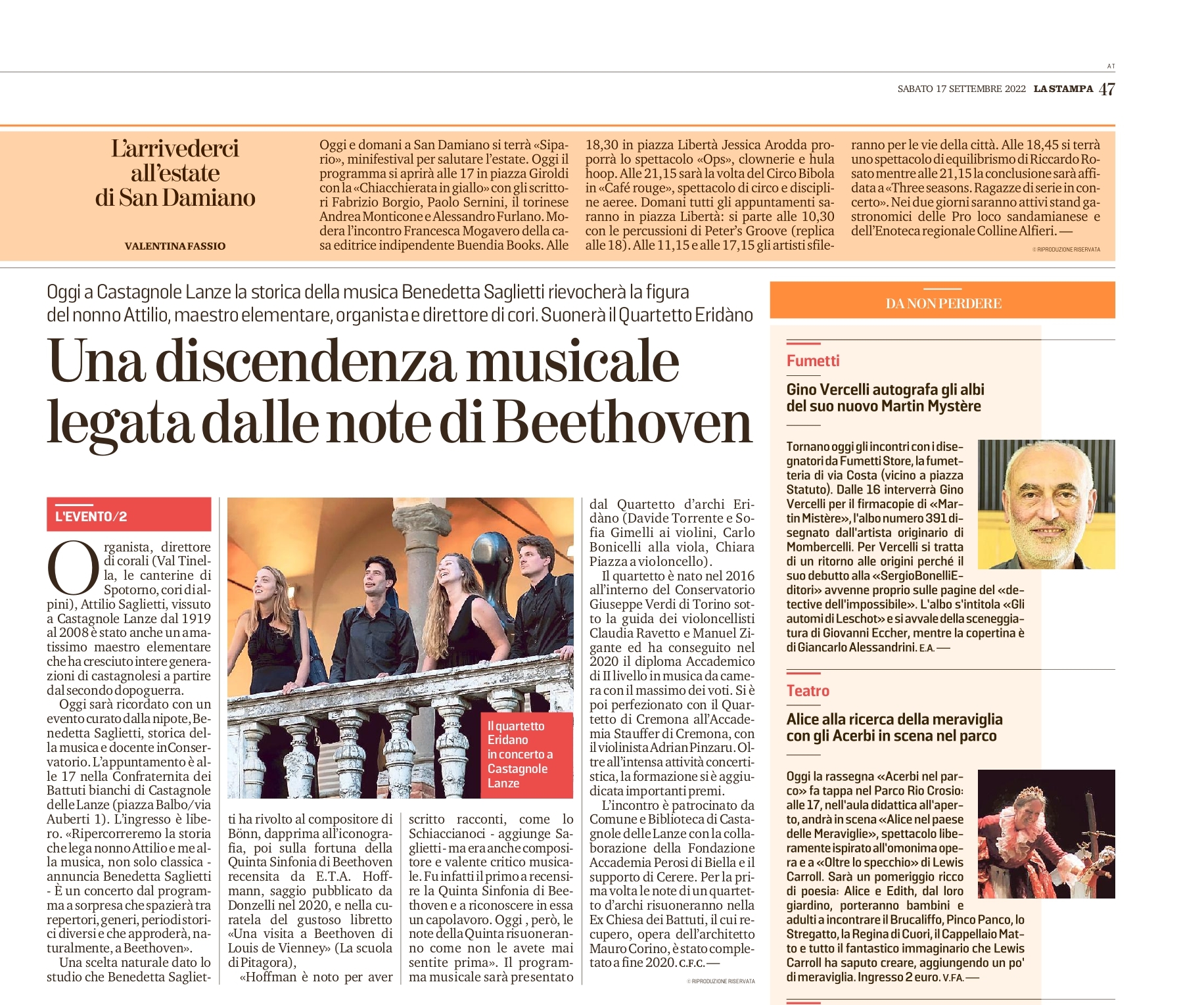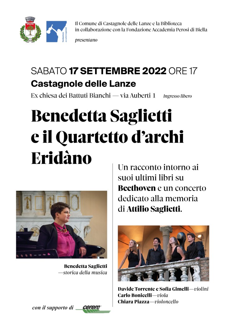 Castagnole delle Lanze: il Quartetto Eridàno per Attilio Saglietti Un racconto per immagini. Foto Cristina Saglietti Chiara Piazza, cello (sx) Sofia Gimelli, violino (dx) Carlo Mancuso, sindaco di Castagnole Lanze Carlo Bonicelli, viola (centro) Davide Torrente, vlno programma-del-concerto-eridano-saglietti-17-settembre_okDownload