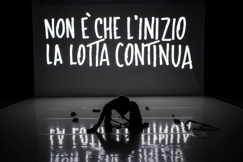 Davide: Agata ha costruito un testo fatto unicamente da parole autentiche dei protagonisti. Noi non abbiamo fatto altro che realizzare il montaggio di diversi elementi: i video d’archivio dei momenti di cui si parla (realizzati con Antropotopia) e quelli di alcuni eventi degli ultimi anni messi in relazione coi primi attraverso un montaggio ad hoc, per farli reagire; il primo piano di Agata è sempre intrecciato a questi materiali (uno dei primi oggetti di scena che vediamo insieme al megafono è infatti un selfie-stick, NdA). Una scelta deliberata perché un elemento che accomuna tutti i protagonisti della lotta, di qualsiasi area politica, è la moltitudine: erano sempre tanti, molti corpi assieme. Invece nella nostra generazione (Davide ha 40 anni, NdA), fino ad arrivare ai ventenni intervistati, si è pochi individui, isolati. E soprattutto sempre mediati, da computer, cellulare, social: Agata è una figura in scena che si rivolge al pubblico anche parlando a un cellulare, guardando in camera, in questo modo la sua immagine arriva agli spettatori mediata dalla proiezione video. Sul piano video le testimonianze di oggi sono fondamentali. Sul piano sonoro indispensabile è stata la ricerca delle canzoni di lotta del passato e del presente.