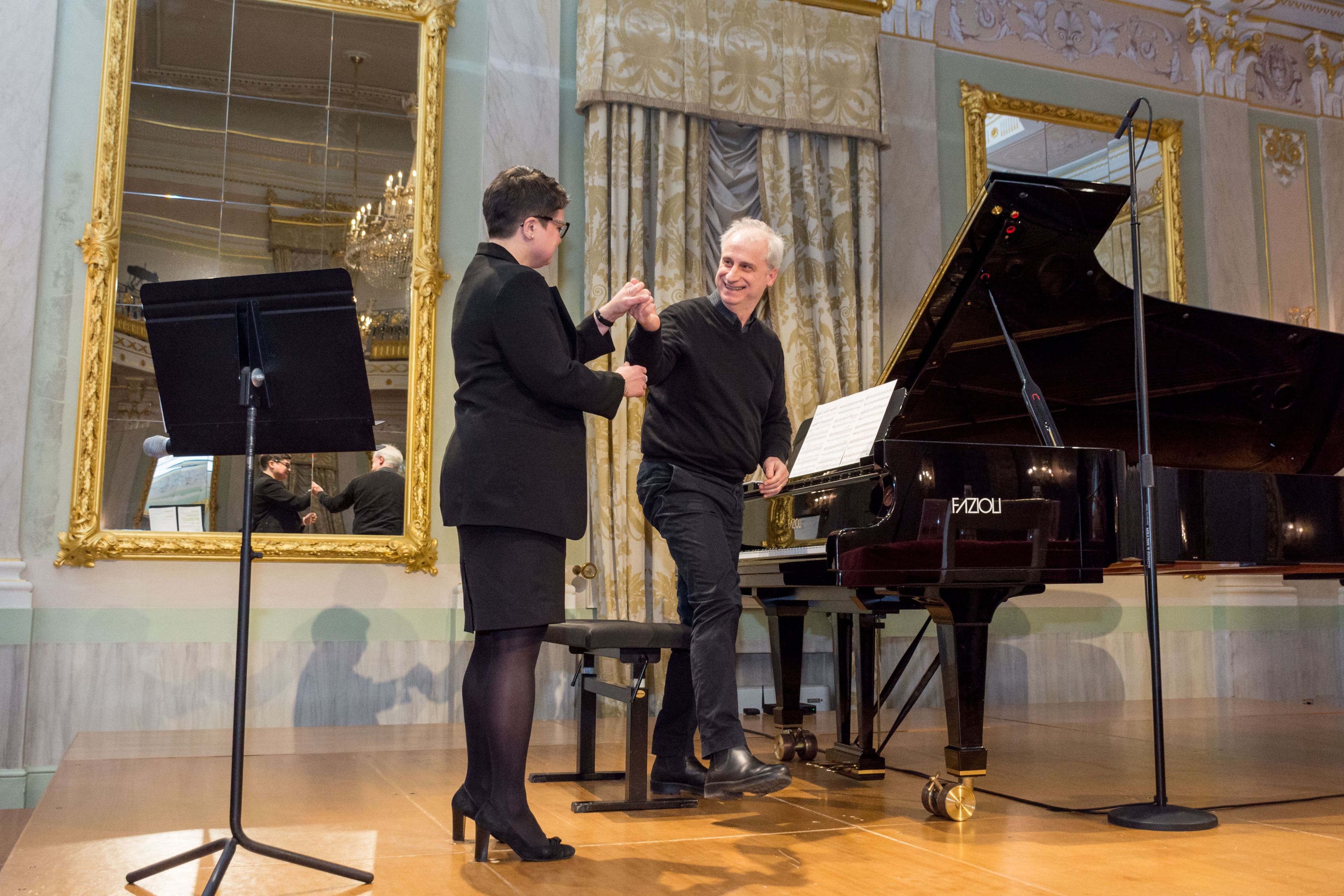 Federico Maria Sardelli, direttore d’orchestra, al mio fianco; Maria Camilla Bianchini D’Alberigo, Presidente degli Amici della Fenice, al microfono; Alberto Boischio, al pianoforte. Jeannette, special guest.